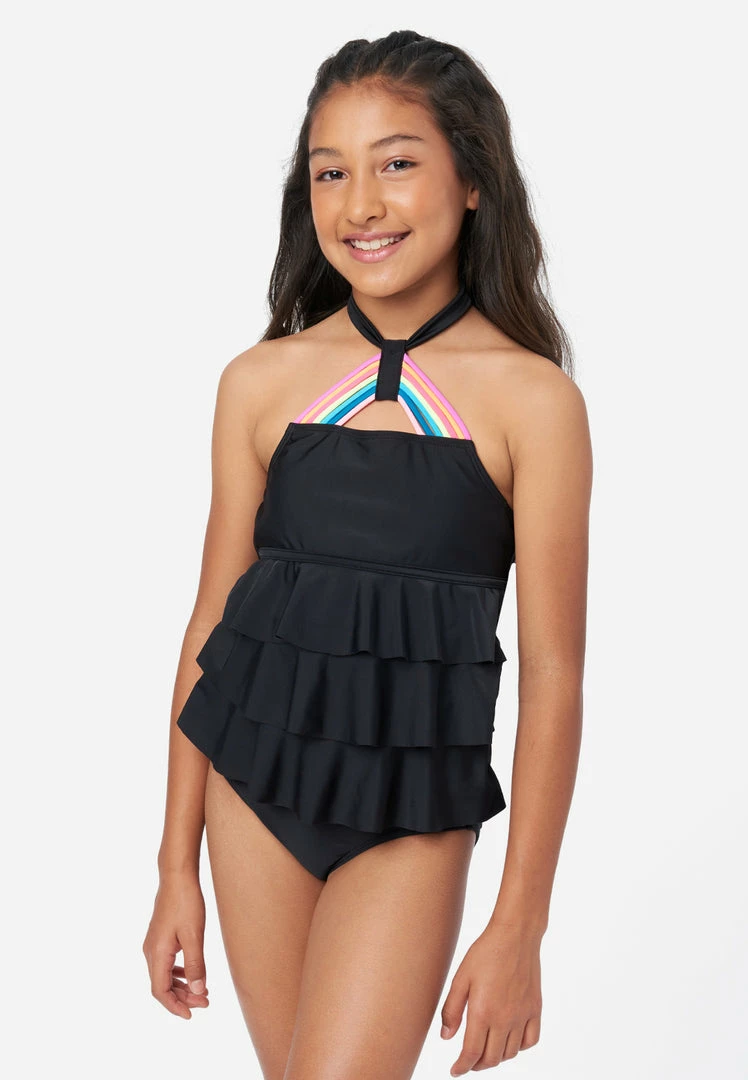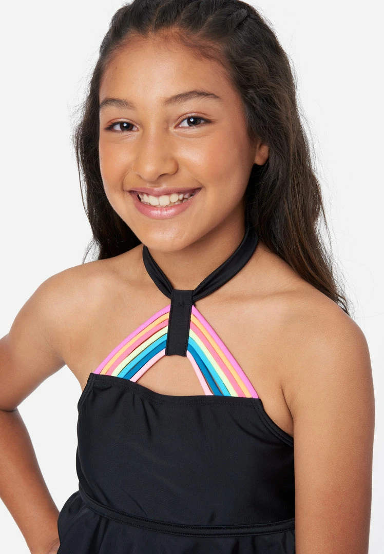Your girls’ swim look will pop in our tankini swim set boasting vibrant rainbow straps—highlighting the halter neckline. The matching bikini bottoms have a slim waistband that keeps them secure. And it’s made from recycled materials enhanced with stretch to keep this style comfy. This also means not only will your girl look good while walking on the sand, but she’ll feel good about reducing her carbon footprint, too.