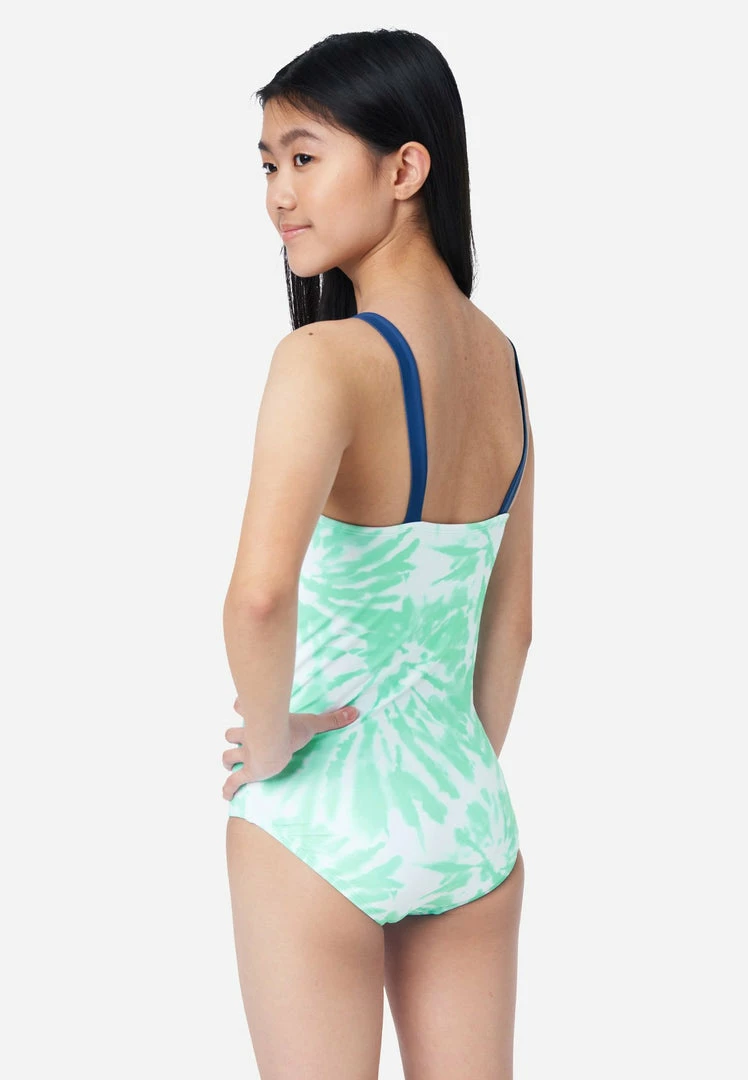 Our girls’ swimsuits sport an allover tie-dye pattern that is sure to make a splash. They have a scoop neckline that introduces two thick color-block straps that secure the fit. And the stretchy fabric keeps this style comfy.