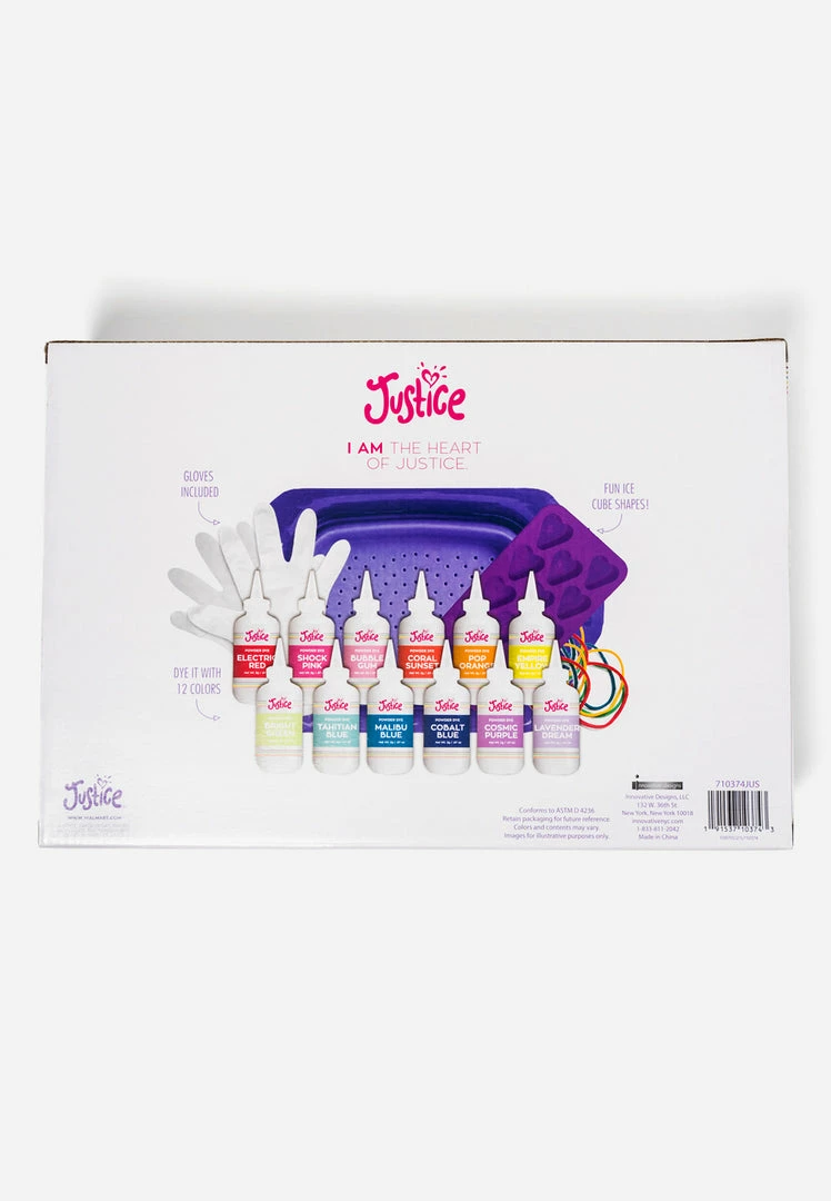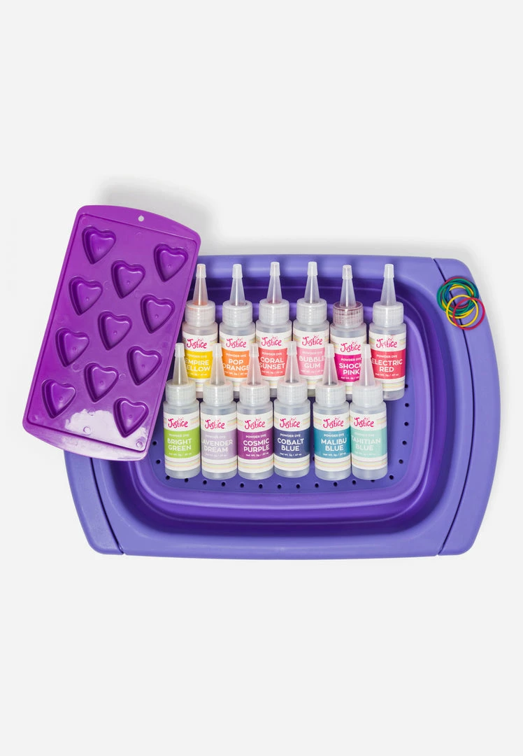 - Includes: colander, twelve dye powders, gloves, plastic table cover, rubber bands, and ice tray