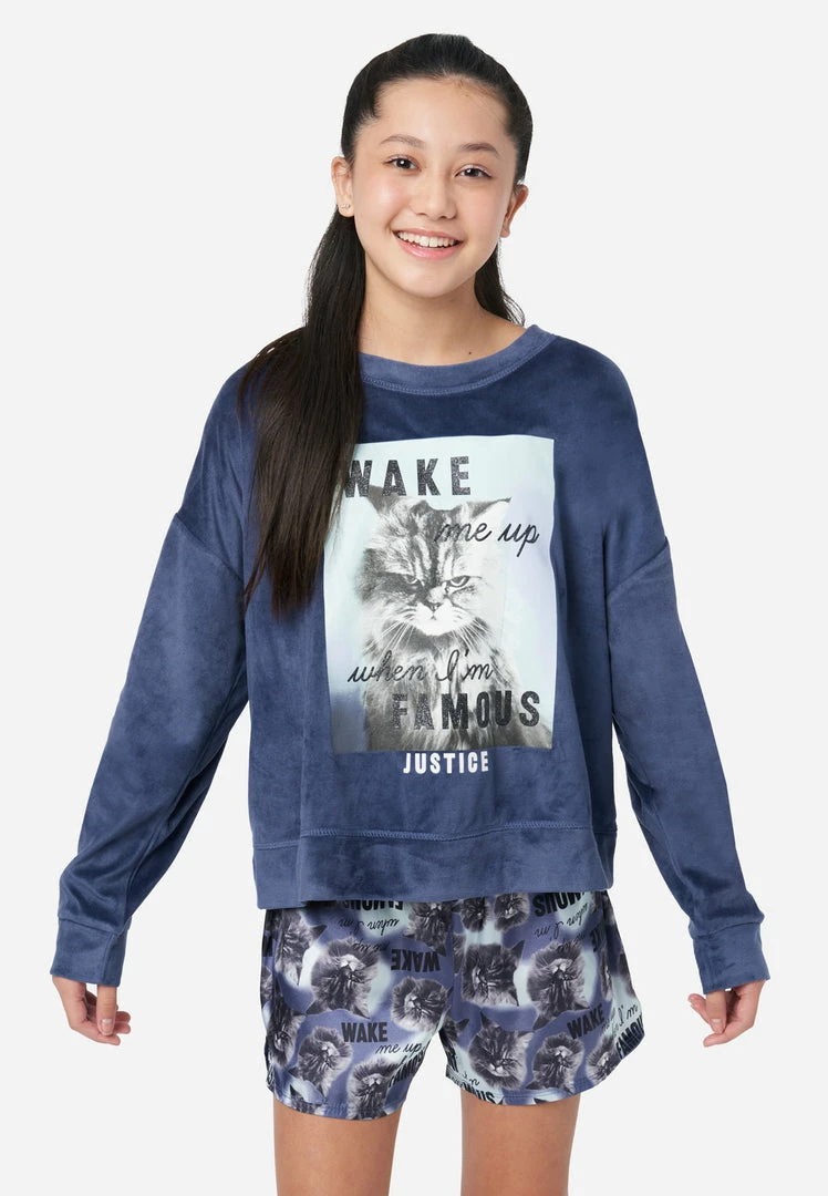 We designed our girl’s crew and shorts sleep set with ultrasoft and breathable fleece fabric that promises a cozy feel. The set has a fun animal design in a multicolored print. And they have a pull-on waistband that’s super stretchy—for on-and-off convenience. They’re the perfect gift, and you can only find them at ShopJustice.com!