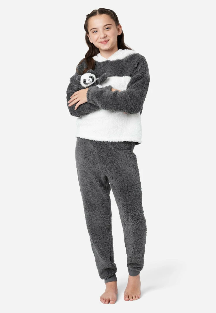 We designed our girl’s pajama set with ultrasoft faux sherpa that promises a cozy feel. Animal ears adorn the hood. The top has a cool color block design. Banded cuffs update the pants with a jogger style. And they have a pull-on waistband that’s super stretchy—for on-and-off convenience. Plus, a sweet stuffed animal is perfect for snuggling on cool nights. They’re the perfect gift, and you can only find them at ShopJustice.com!