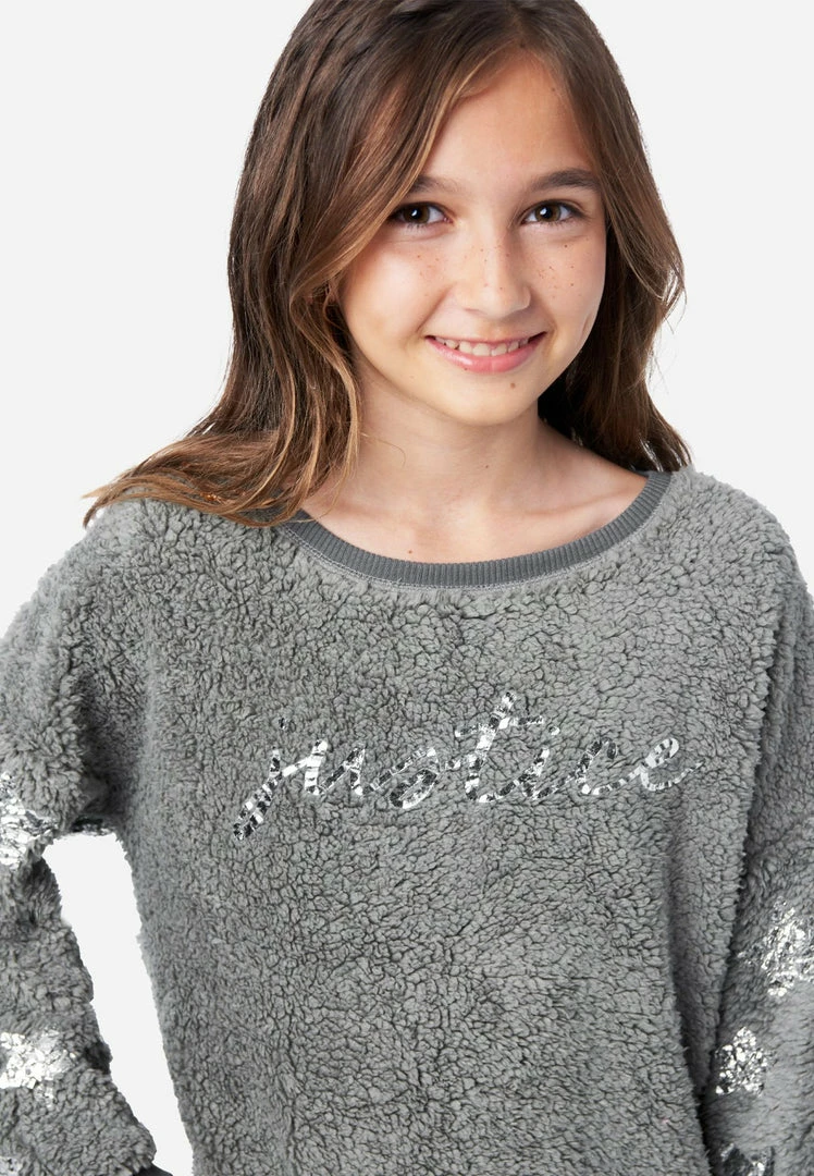 We designed our girls’ pajama sets with ultrasoft faux sherpa that promises a cozy feel. A pattern on the long sleeves and back of the top and bottoms brings standout style. The top has a crew neckline and drop shoulders. A bold Justice graphic punctuates the front. The pants have a pull-on waistband that’s super stretchy—for on-and-off convenience. And they come with a pair of matching socks. They’re the perfect gift, and you can only find them at ShopJustice.com!Â