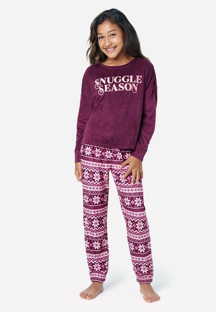 We designed our girls’ pajama sets with super-soft fabric that promises a cozy feel. The top has a crew neckline. Long sleeves make it perfect for cool nights. A standout graphic with sentimental messaging highlights the front. The pants have a pull-on waistband that’s super stretchy—for on-and-off convenience. And the standout pattern gives them classic style. Â