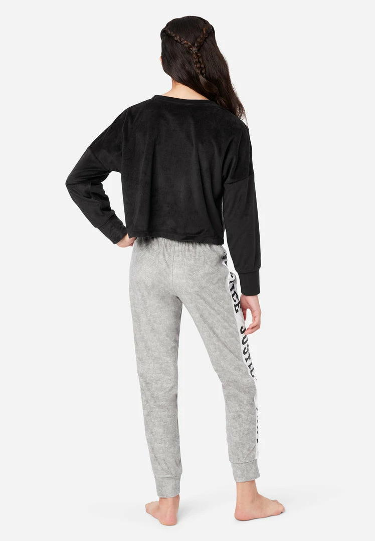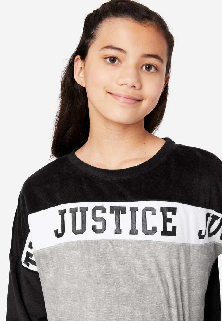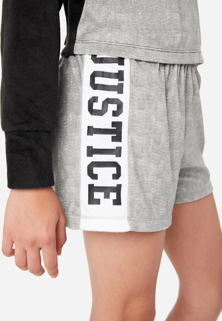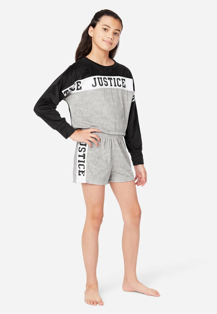 We designed our girls’ pajama sets with super-soft fleece fabric that promises a cozy feel. The set comes with shorts and pants for versatile wear on cool and warm nights. The top has a crew neckline. Shining graphics highlight the front of the top—plus they run along the sides of the shorts and pants. The shorts and pants both have pull-on waistbands that are super stretchy—for on-and-off convenience. And the color block design has juxtaposed textures for fun pattern play. Â