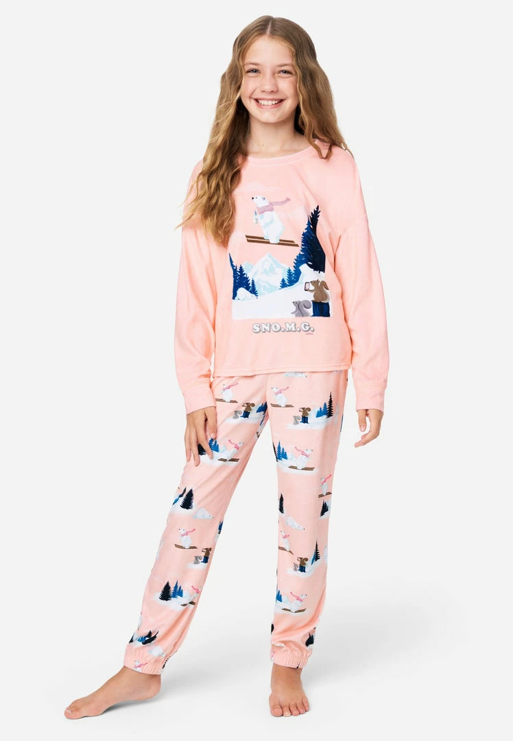 We designed our girls’ pajama sets with super-soft fabric that promises a cozy feel. The top has a crew neckline. Long sleeves make it perfect for cool nights. A standout graphic with sentimental messaging highlights the front. The pants have a pull-on waistband that’s super stretchy—for on-and-off convenience. And the standout pattern gives them classic style. Â