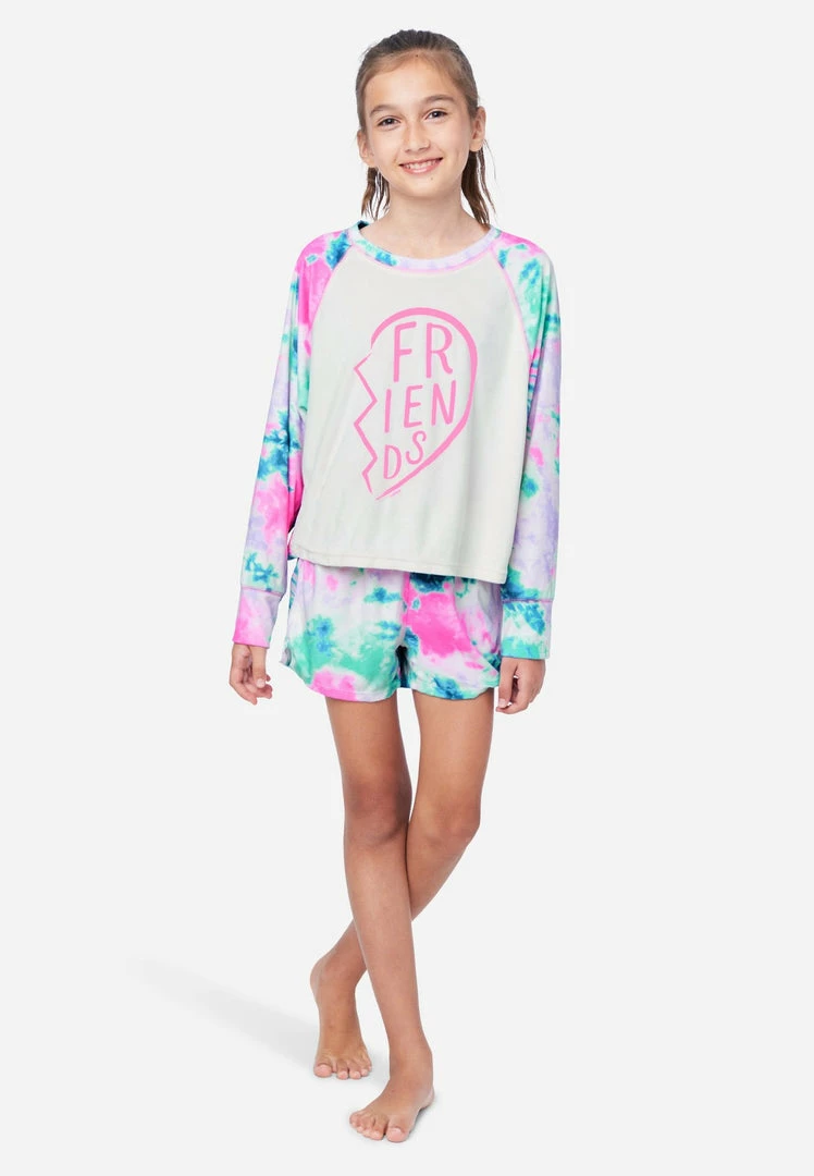 We designed our girls’ pajama sets with super-soft fabric that promises a cozy feel. A pattern on the long raglan sleeves and shorts brings standout style. The top has a crew neckline and bold graphic on the front. The shorts have a pull-on waistband that’s super stretchy—for on-and-off convenience. Buy them with style 162386 as the perfect gift for your girl and her bestie, and you can only find them at ShopJustice.com!