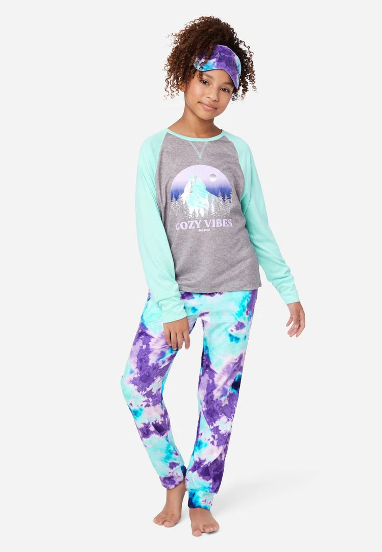 We designed our girls’ pajama sets with super-soft fabric that promises a cozy feel. The top has a crew neckline and raglan design. Long sleeves make it perfect for cool nights. A standout graphic with sentimental messaging highlights the front. The pants have a pull-on waistband that’s super stretchy—for on-and-off convenience. Plus, banded cuffs give them classic style. And a matching eye mask keeps the light at bay for mornings when she wants to sleep in.