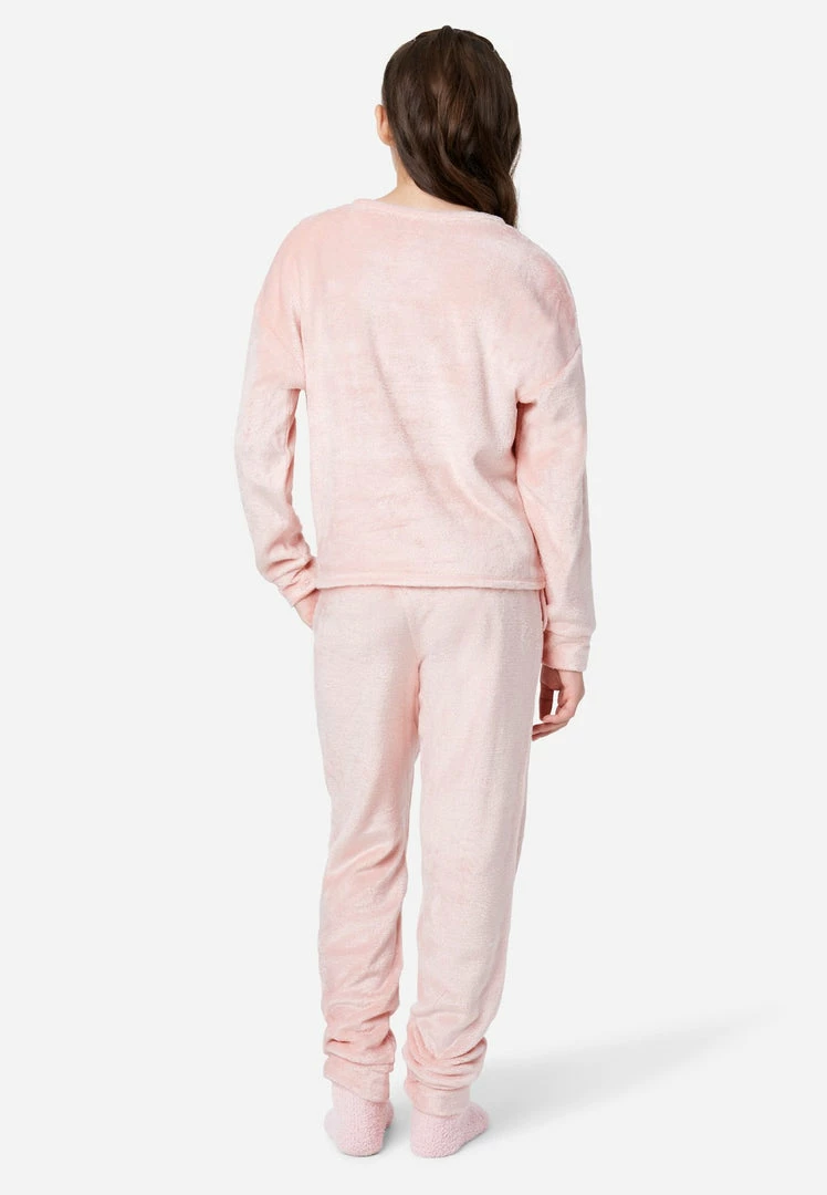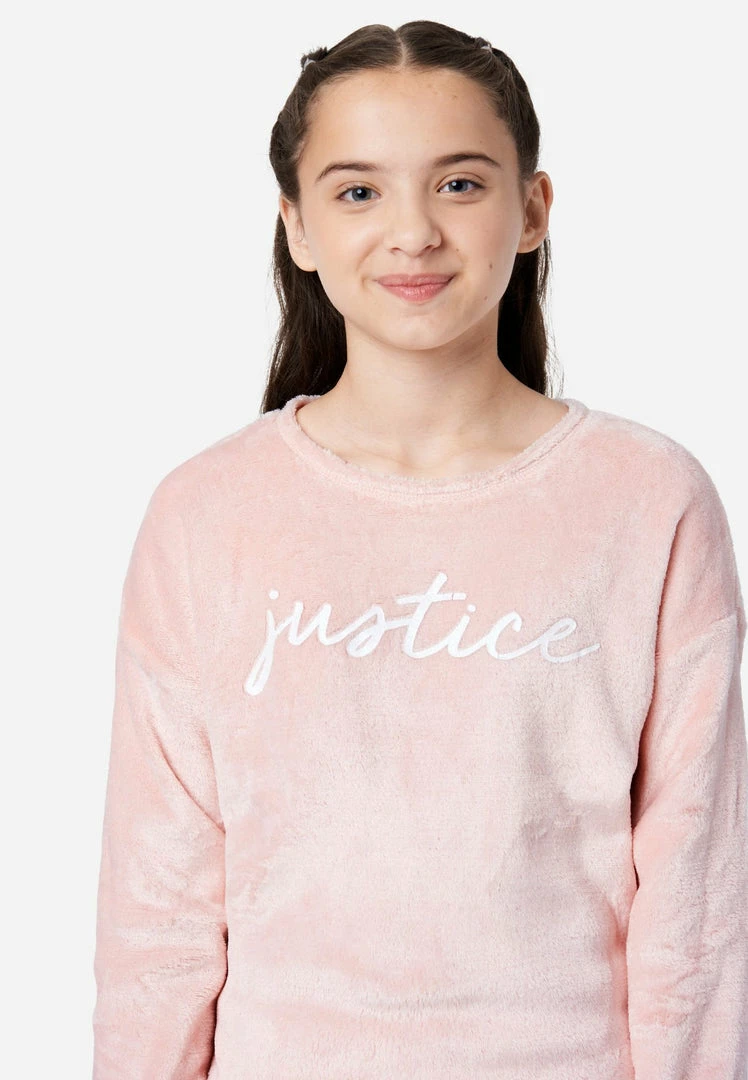 We designed our girls’ pajama sets with plush fabric that promises a cozy feel. An allover pattern brings standout style. The top has a crew neckline. A cool Justice graphic punctuates the front. Long sleeves will make it comfy for cool nights. The pants have a pull-on waistband that’s super stretchy—for on-and-off convenience. And they have classic banded cuffs. Plus, they come with a pair of matching socks. They’re the perfect gift, and you can only find them at ShopJustice.com!