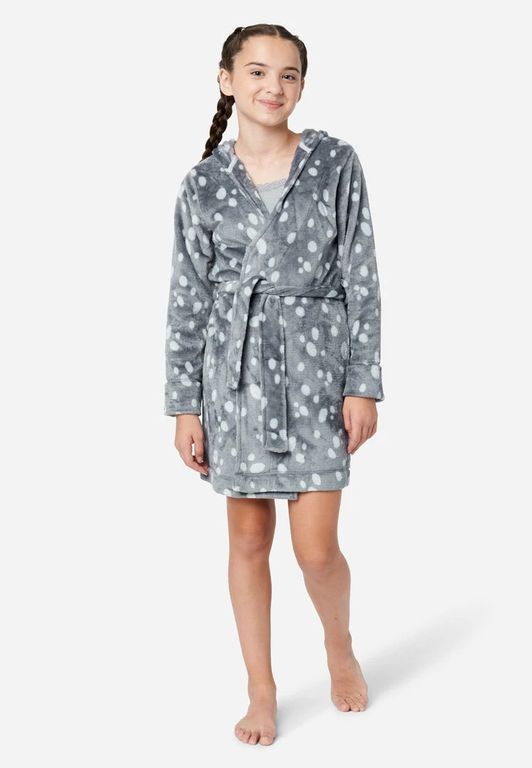 We designed our girl’s robe with ultrasoft plush fabric that promises a cozy feel. Animal ears adorn the hood. It has a removable belt that ties at the waist for secure wear. And an allover pattern brings standout style. She can use it after bathing or layer it over PJs for an extra-snuggly vibe. It’s the perfect gift, and you can only find it at ShopJustice.com!Â