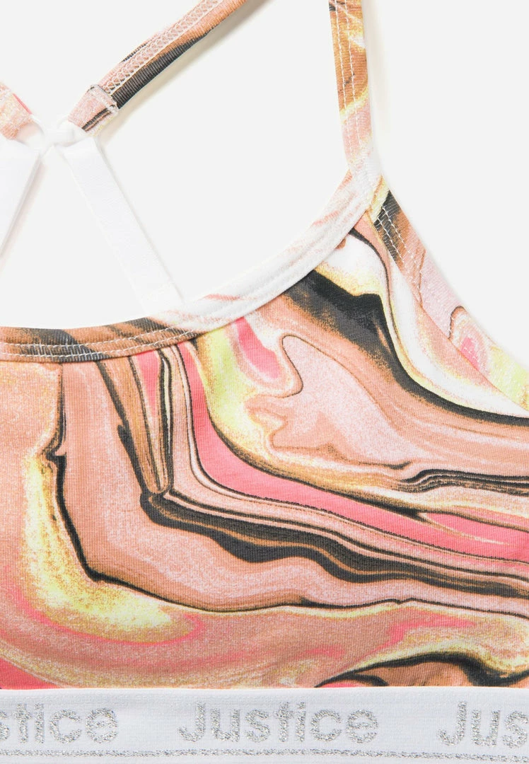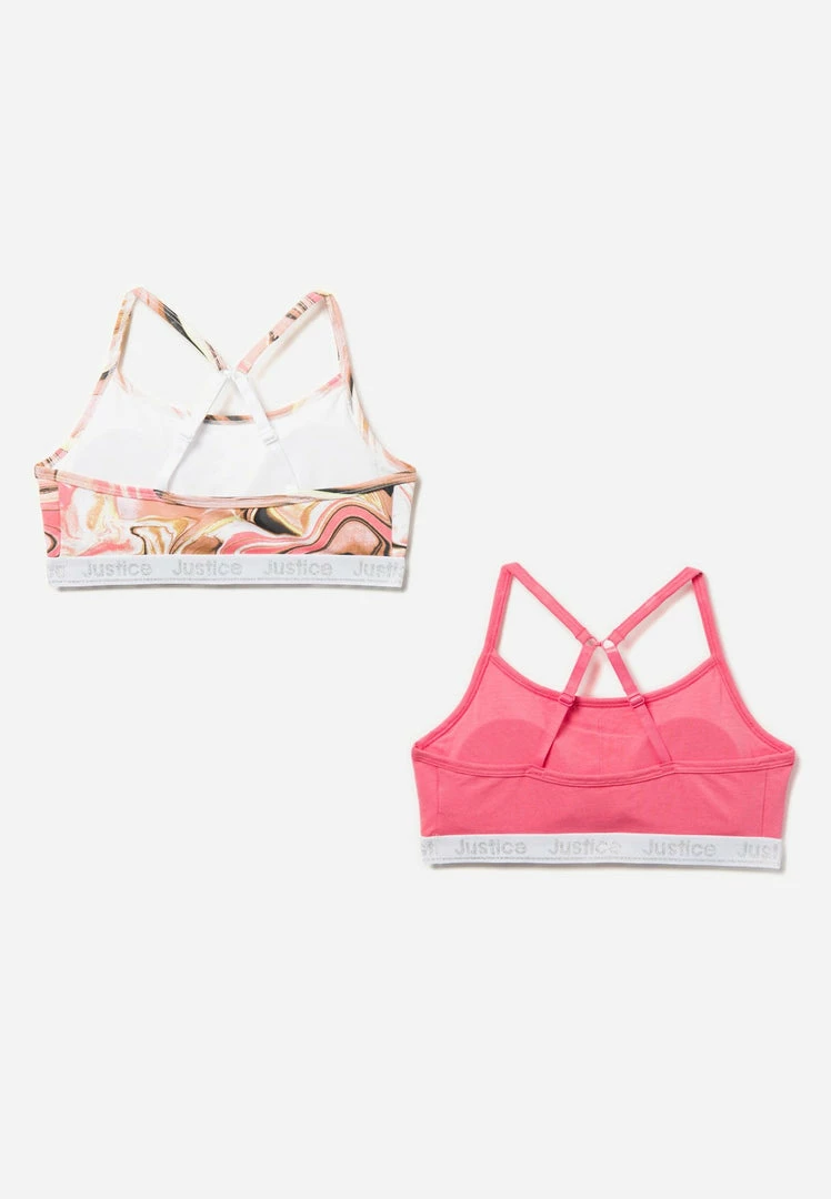 Our girls’ bralettes have classic scoop necklines which create a form-fitting shape. They’re wireless with a ton of stretch—which promises a comfy fit. Adjustable straps and a sleek band keep them secure. Justice logo elastic gives the band for extra panache. They have a small hook that allows her to convert them into a racerback style. And this set has an array of bright hues and patterns she’ll love matching with her outfits.