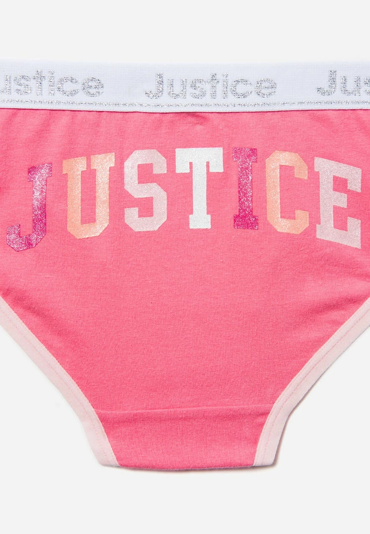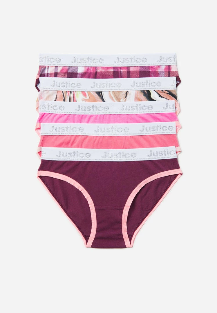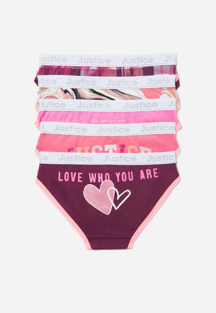 Our girls’ undies are a subtle first layer for confidently styling her looks. They lend full coverage. The stretchy waistband promises a secure fit—plus it’s made of Justice logo elastic. A cool graphic graces the back. The super-soft fabric gives them an oh-so-cozy feel. Plus, this set has an array of bright hues and patterns she’ll love matching with her outfits.
