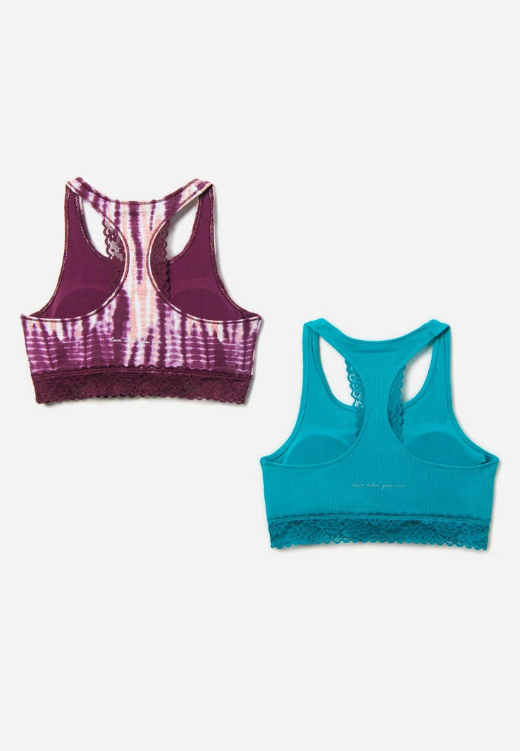 Our girls’ bras have classic scoop necklines which create a form-fitting shape. Ribbing gives them playful texture. The bands and wide straps promise a secure fit. Light padding gives your girl an extra layer of confidence. They’re wireless with a ton of stretch—which promises comfy wear. Dainty lace traces the sleek band and racerback. Plus, this set has an array of bright hues and patterns she’ll love matching with her outfits.